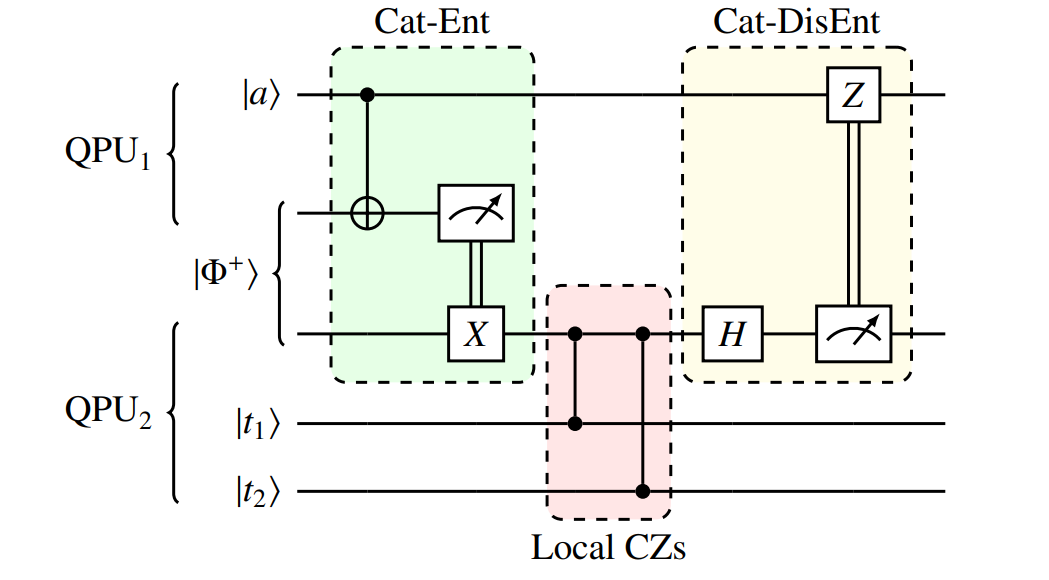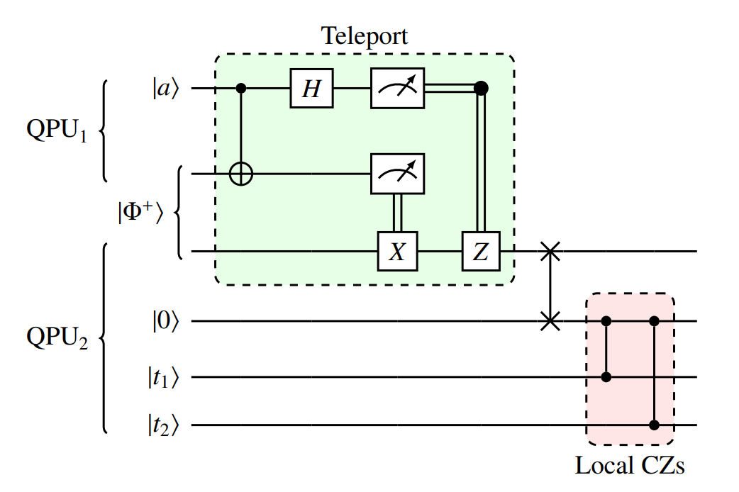 Quantum gate teleportation, also known as telegate, reduces the topological requirements by substituting two-qubit gates with other cost-effective resources: auxiliary entangled states, local measurements, and single-qubit operations [#]_. This is another feature available in